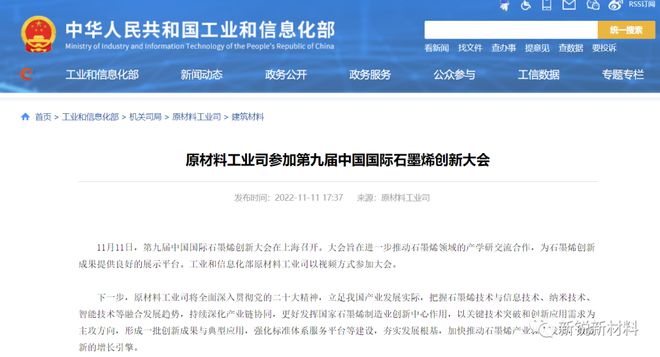 11月11-19日,由上海市寶山區人民政府、上海大學和石墨烯聯盟(CGIA)聯合主辦的2022(第九屆)中國國際石墨烯創新大會在上海寶山舉行。工業和信息化部原材料工業司參加大會,并組織召開石墨烯行業領袖峰會,探討產業未來發展路徑。